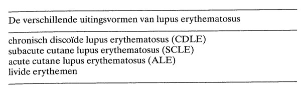 Bij LE wordt vaak onderscheid gemaakt tussen ‘SLE’ en ‘cutane LE’; met ‘cutaan’ wordt bedoeld: tot de huid beperkt. Dit onderscheid berust op een misvatting: vaak gaan huidafwijkingen gepaard met algemene verschijnselen en zijn ze dus een symptoom van SLE. Dit zien wij bij de veel voorkomende CDLE van gelaat en behaard hoofd slechts in 5-10 van de gevallen, soms pas na 20 of 30 jaar. Bij de verspreid voorkomende CDLE (gelaat, hoofd, armen, romp) is dit vaker het geval. SCLE gaat in circa 50 van de gevallen met SLE gepaard; de aandoening is vaak matig ernstig. De prognose is meestal goed, alhoewel ook hier dodelijk verloop voorkomt.