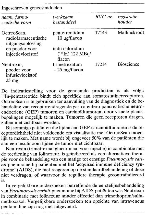 Het College ter boordeling van geneesmiddelen heeft in de maand december 1994 de volgende geneesmiddelen, met een voor Nederland nieuw werkzaam bestanddeel, ingeschreven: