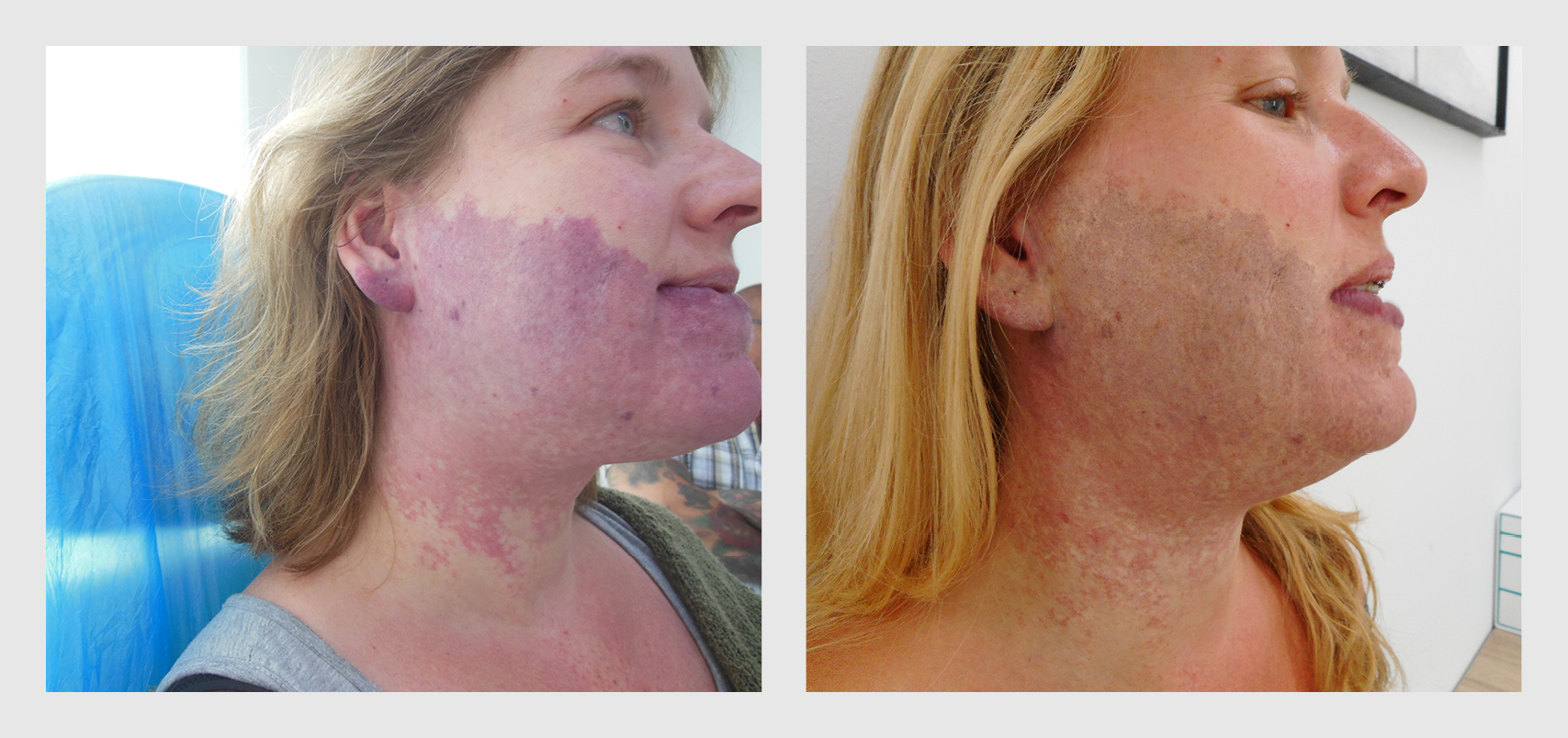 Patiënt A, een 44-jarige vrouw, werd geboren met een naevus flammeus (wijnvlek) in het gelaat. Aanvankelijk camoufleerde zij de wijnvlek dagelijks met make-up. Vanaf haar 14e tot en met haar 40e levensjaar onderging zij verschillende soorten laserbehandelingen, met beperkt effect. Door de laserbehandeling waren er verbrandingen van het gelaat opgetreden, met littekenvorming als gevolg. Littekenvorming bij laserbehandeling treedt op bij belichting met te hoge energiedichtheid of onvoldoende koeling. Bij onze patiënte vielen deze littekens, in combinatie met de nog altijd duidelijk zichtbare naevus flammeus, niet meer goed te camoufleren (figuur 1).
