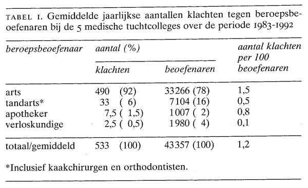 Door de 5 tuchtcolleges werden in de periode 1983-1992 in totaal 5333 klachten behandeld; dat is gemiddeld 533 per jaar. Het aantal klachten per jaar verdubbelde in de onderzoeksperiode van 370 in 1983 tot 720 in 1992 (waarvan respectievelijk 336 en 647 tegen artsen). Het totale aantal artsen in Nederland steeg in die 10 jaar met 30, van 28.807 naar 37.461. Verreweg de meeste klachten (49045333; 92) waren tegen artsen gericht. Ook de klachtendichtheid was voor artsen het hoogst, namelijk 1,5 klacht per jaar per 100 artsen (tabel 1).
