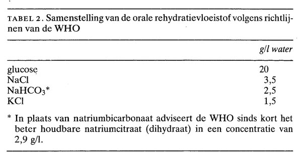 Gezien het grote praktische belang zal wel kort worden ingegaan op de orale rehydratie. Bespreking van de causale therapie, zoals de antimicrobiële therapie bij infectieuze diarree, valt buiten het bestek van dit artikel. Evenzo zal niet worden ingegaan op de anti-inflammatoire behandeling met salazosulfapyridine en glucocorticosteroïden, zoals deze wel wordt gegeven bij de ziekte van Crohn en colitis ulcerosa. Ten overvloede zij opgemerkt dat salazosulfapyridine geen plaats heeft bij de symptomatische behandeling van diarree.