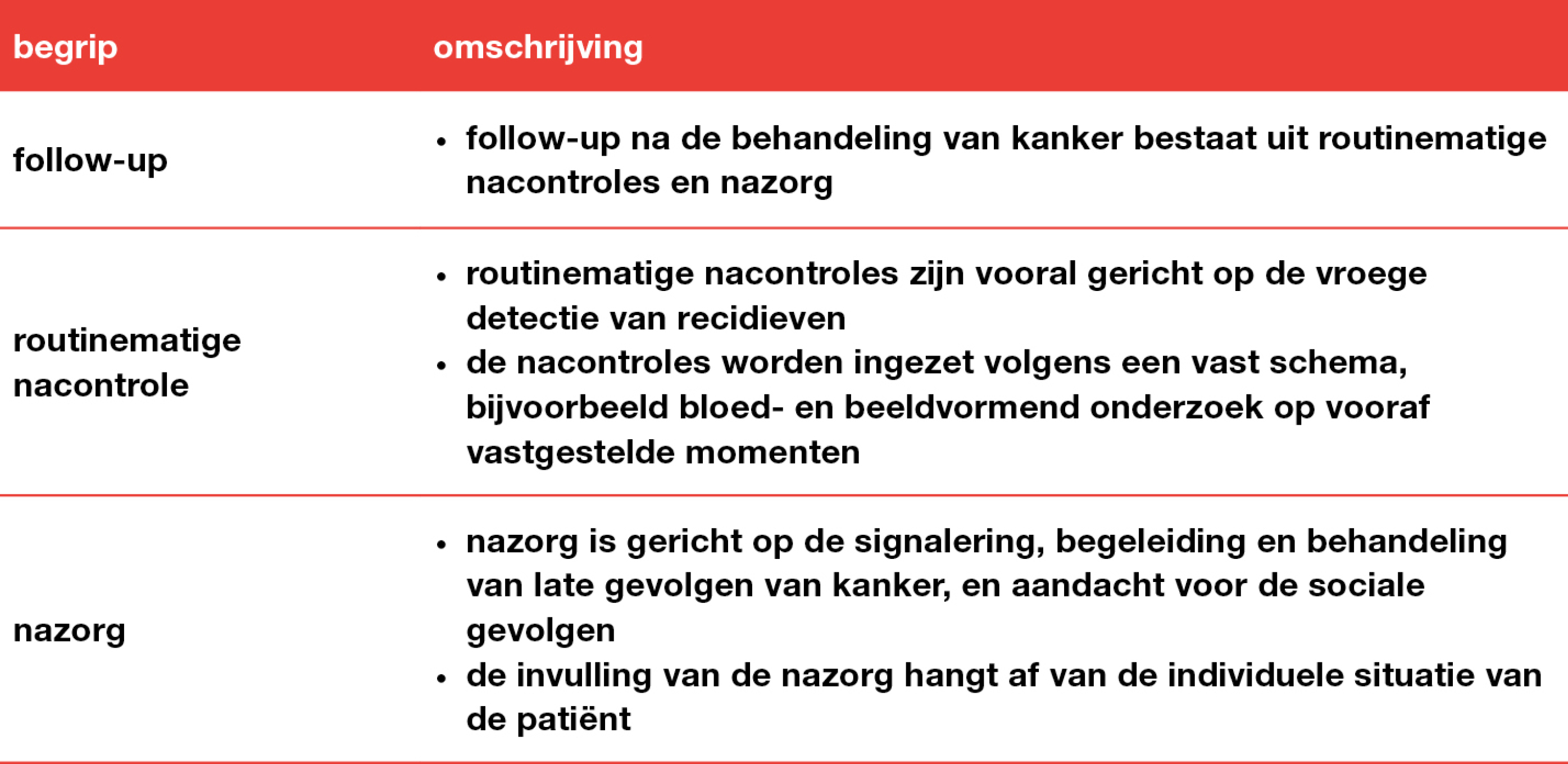 De follow-up van patiënten die in opzet curatief behandeld zijn voor kanker bestaat enerzijds uit routinematige nacontroles, vooral gericht op een vroege detectie van recidieven, en anderzijds uit nazorg, gericht op signalering, begeleiding en de behandeling van late gevolgen van kanker (tabel).1 Deze patiënten ervaren nog jarenlang lichamelijke of psychische klachten. De follow-up wordt vaak als waardevol, maar soms ook als stressvol ervaren.
