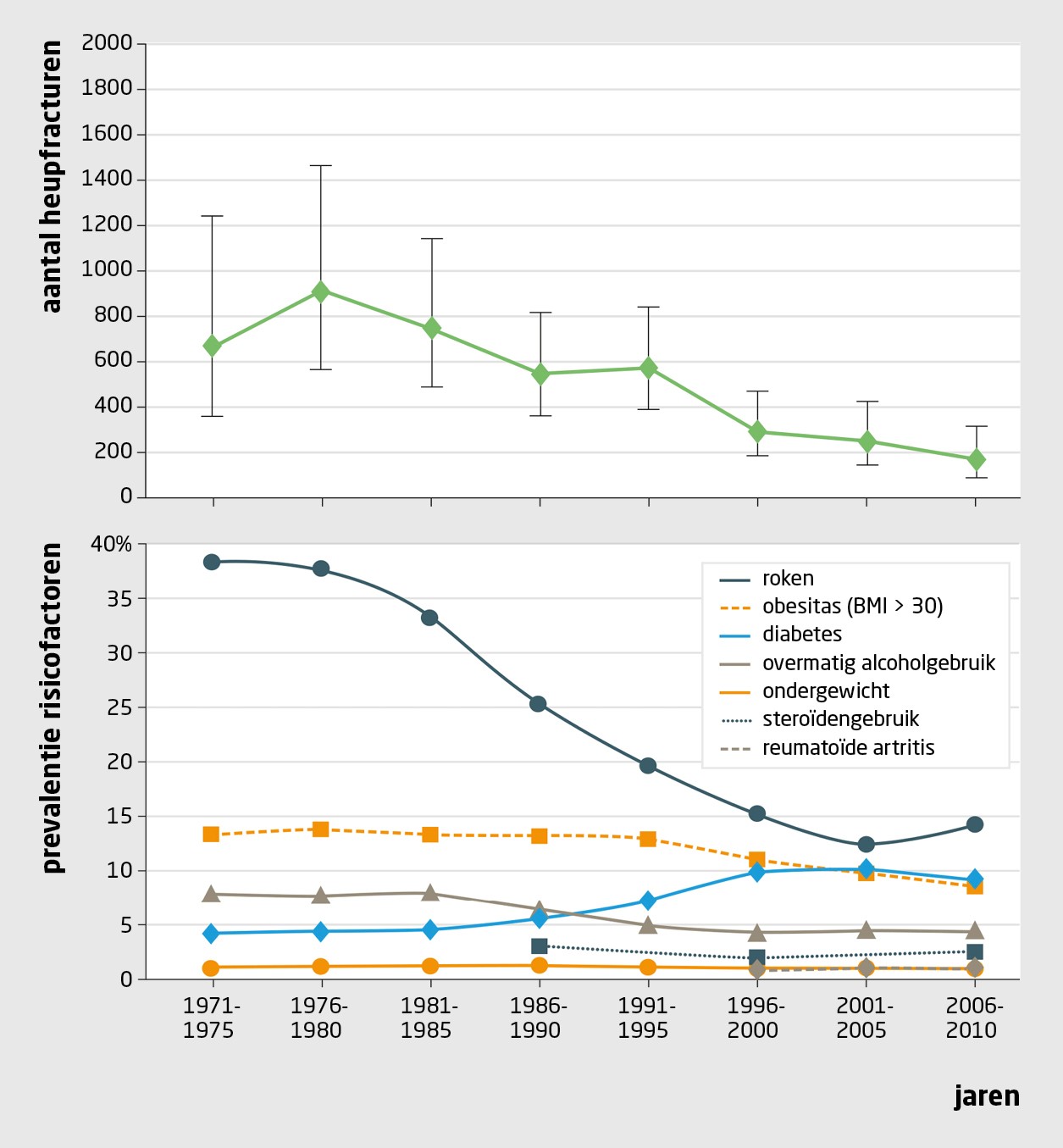 De incidentie van heupfracturen (boven) en de prevalentie van 7 risicofactoren voor heupfracturen (onder) in de periode 1971-2010 in de ‘Framingham Heart Study’. Voor deze studie volgden onderzoekers 60+’ers uit Framingham (Massachusetts, VS) en hun kinderen zodra zij de 60 jaar ook waren gepasseerd. Dit waren er in de onderzoeksperiode…