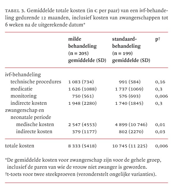 Er werden 404 patiënten gerandomiseerd voor de milde behandeling, die bestond uit ovariële stimulatie met gonadotropine-‘releasing’-hormoon(GnRH)-antagonist in combinatie met het terugplaatsen van 1 embryo, of de standaardbehandeling volgens het protocol van langdurige stimulatie met GnRH-agonist en terugplaatsing van 2 embryo’s. De primaire uitkomstmaten waren het percentage cumulatieve zwangerschappen leidend tot een aterm levendgeboren kind binnen 1 jaar na randomisatie, totale kosten per paar tot 6 weken na de uitgerekende datum en totale patiëntenongemak. De analyse om aan te tonen dat de milde behandeling niet inferieur was aan de standaardbehandeling werd gedaan volgens het ‘intention to treat’-principe met een non-inferioriteitsdrempel van –12,5.