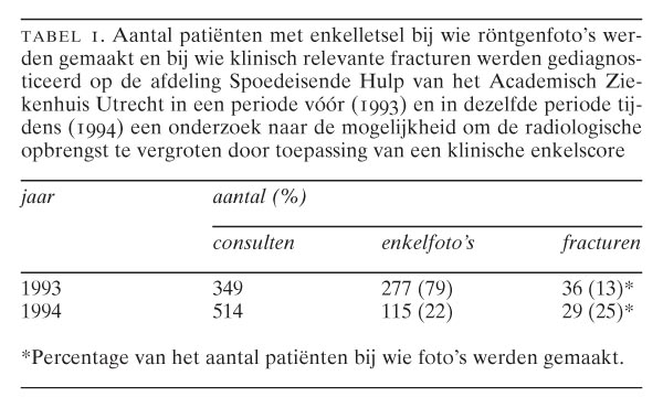 Uit de resultaten van een retrospectief onderzoek in 1993 in het Academisch Ziekenhuis Utrecht (AZU) bleek dat bij patiënten met enkelletsels die zich op de afdeling Spoedeisende Hulp presenteerden, in bijna 80 van de gevallen röntgenfoto's werden gemaakt. Slechts op 10 van deze foto's werden ossale afwijkingen gezien en bij maar tweederde van deze patiënten was het letsel zo ernstig dat specifieke behandeling was geïndiceerd (tabel 1). Deze teleurstellende opbrengst was aanleiding om te kiezen voor een andere aanpak.