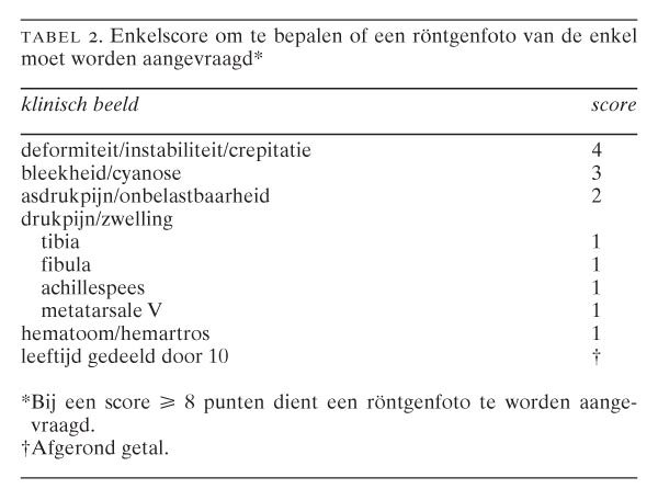 Met primair het doel om het aantal enkelfoto's maximaal te reduceren werd in ons onderzoek het diagnostisch beleid bij patiënten met enkelletsels bepaald aan de hand van geprotocolleerd fysisch-diagnostisch onderzoek met behulp van een scoresysteem. Als uitgangspunt werd de score genomen die door Kievit in het Academisch Ziekenhuis Leiden werd ontwikkeld.1213 Op grond van persoonlijke ervaring en voorkeur van de onderzoekers werden enige kleine aanpassingen verricht, met als resultaat toekenning van punten volgens tabel 2. Systematisch lichamelijk onderzoek van het onderbeen en de voet werd verricht om de aanwezigheid van de symptomen cyanose, hematomen, instabiliteit, crepitatie en asdrukpijn en lokale drukpijn, zoals opgenomen in de score, vast te stellen. Ook de leeftijd werd in de score opgenomen. Op grond van de veronderstelling dat na enkeltraumata op oudere leeftijd vaker een fractuur optreedt, werden bij hogere leeftijd meer punten toegekend. Het totale aantal punten dat toegekend kon worden bedroeg minimaal 3 en maximaal 23. Indien het aantal punten groter dan of gelijk was aan de grenswaarde van 8 punten, diende men een röntgenfoto aan te vragen.