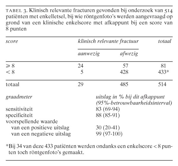Bij 81 van de geïncludeerde 514 patiënten werd de grenswaarde van 8 punten bereikt; bij 24 van hen werd een klinisch relevante fractuur aangetoond. Een enkelfoto werd bij 34 patiënten gemaakt ondanks het feit dat de score lager was dan 8 punten; daarbij werden 5 relevante fracturen aangetoond. Bij de afkapwaarde van 8 punten nam het aantal aangevraagde röntgenfoto's met 60 af (met de ‘Ottawa ankle rules’ zou de afname in deze patiëntengroep 28 zijn geweest). De voorspellende waarde van een positieve en een negatieve uitslag was respectievelijk 30 (95-betrouwbaarheidsinterval (95-BI): 20-41) en 99 (95-BI: 97-100). De oppervlakte onder de ROC-curve bedroeg 91 (95-BI: 84-98).