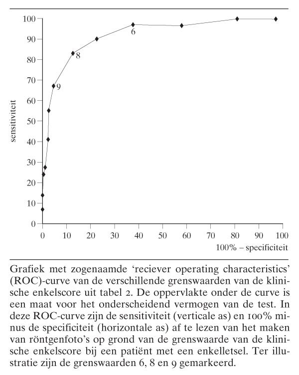 Wat is echter acceptabel voor klinische toepassing? Uit de ROC-curve blijkt dat voor de lagere grenswaarden van de test een verbetering van de resultaten wordt verkregen in de zin van minder gemiste relevante fracturen. Kiezen voor een lagere waarde heeft echter als consequentie een toename van het aantal enkelfoto's, hetgeen niet gewenst is. In het AZU is daarom gekozen voor handhaving van de grenswaarde van 8 punten in de eerder beschreven score, waarbij bewust wordt geaccepteerd om ook in de toekomst enkele fracturen niet te diagnosticeren. Door verdere verhoging van de grenswaarde zou het aantal röntgenfoto's maar weinig verminderen, terwijl het missen van relevante letsels onevenredig zou toenemen.
