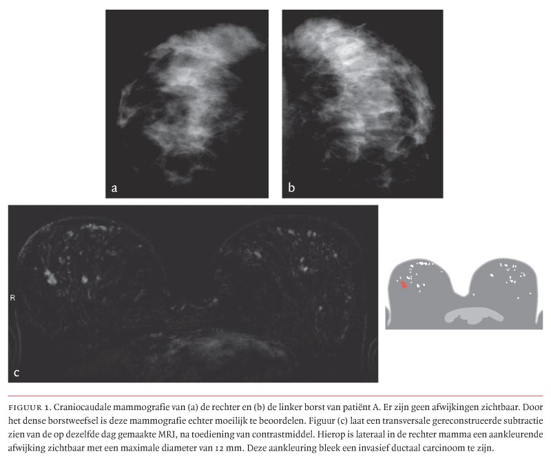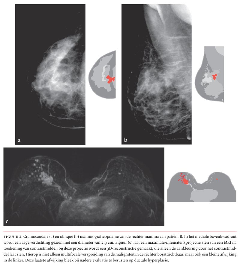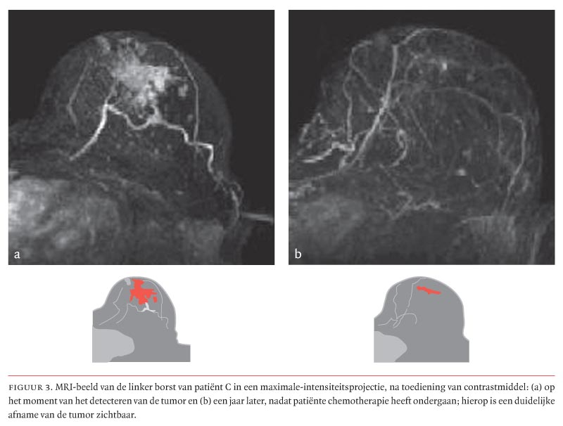 Bij 3 vrouwen in de leeftijd van 45, 37 en 56 jaar werd MRI van de mammae toegepast respectievelijk om op mammacarcinoom te screenen, mammacarcinoom te stadiëren en om de respons van de tumor op chemotherapie te monitoren. Bij de eerste vrouw werd mammacarcinoom door MRI in een vroeg stadium ontdekt, waardoor borstsparende behandeling mogelijk was. Bij de tweede vrouw bleek de tumor groter te zijn dan bij mammografie of echografie en werden er meerdere tumorlocaties gevonden; daarop werd het behandelplan uitgebreid tot een volledige borstamputatie en werd adjuvant chemotherapie gegeven. In het eerste jaar na deze behandeling werden geen uitzaaiingen gevonden. Bij de derde vrouw werd de respons op chemotherapie nauwkeurig in beeld gebracht. 8 maanden na een amputatie en chemotherapie bleek zij alsnog botmetastasen te hebben. Voor beeldvorming van de borst zijn mammografie en echografie de meest gebruikte methoden. De afgelopen jaren heeft MRI een steeds grotere bijdrage geleverd aan het opsporen en stadiëren van borstkanker en het controleren na behandeling. Het onderzoek kan een toegevoegde waarde hebben. De exacte rol moet nog worden bepaald.