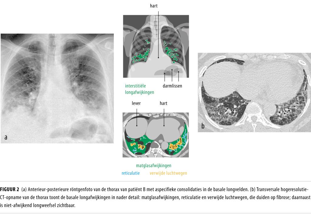 Patiënt B, een 59-jarige vrouw, werd verwezen naar de polikliniek Longziekten vanwege sinds 2 jaar toenemende, inspanningsgebonden benauwdheid en hoesten. Tevens had ze sinds enkele maanden pijn in de handen en ervoer zij zwakte, vooral bij het traplopen. De voorgeschiedenis vermeldde coronairlijden en huidafwijkingen verdacht voor chronische discoïde lupus erythematodes.