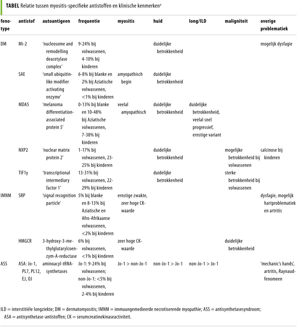 Myositis-specifieke autoantistoffen worden bij 50-70% van de volwassenen patiënten gevonden en helpen om het ziektebeeld te karakteriseren (tabel).4 De verwachting is dat de verschillende autoantistoffen op termijn een belangrijke rol zullen spelen in de classificatie.
