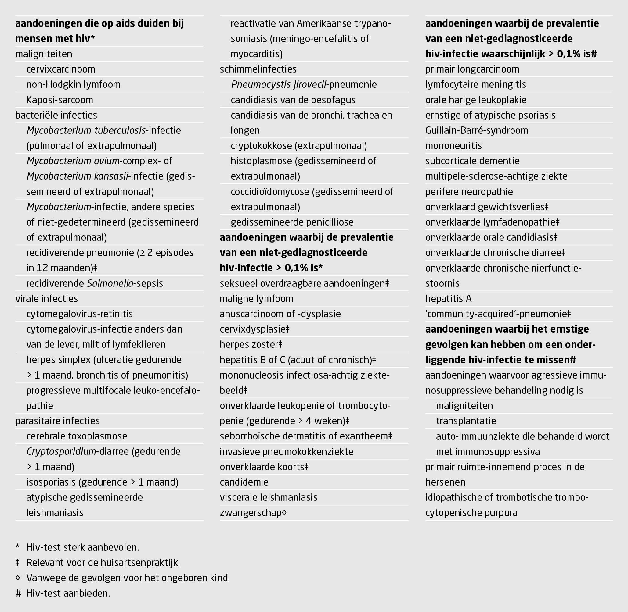 In de jaren na het oplopen van hiv treden bij de meeste mensen klinische verschijnselen op die wijzen op een hiv-infectie, zogenoemde hiv-indicatoraandoeningen (zie uitleg en tabel). Deze aandoeningen treden vaak al op nog voordat er sprake is van aids of zijn een uiting van aids, het syndroom dat gepaard gaat met een sterk verlaagd CD4+-T-celgetal waardoor de cellulaire afweer ernstig verminderd is. Zonder tijdige herkenning en interventie leidt dit nagenoeg altijd tot 1 of meerdere aids-definiërende ziekten. De hiv-indicatoraandoeningen omvatten een verscheidenheid aan duidelijk omschreven klinische aanwijzingen voor een onderliggende hiv-infectie waar patiënten mee bij de huisarts of in het ziekenhuis kunnen komen. Ook de zogenoemde aids-definiërende aandoeningen vallen hier dus onder. Dit zijn onder andere opportunistische infecties en maligniteiten; wanneer 1 of meerdere van deze aandoeningen worden vastgesteld bij een persoon met een hiv-infectie spreekt men van aids. Wanneer een indicatoraandoening wordt vastgesteld moet daarom hiv-diagnostiek worden ingezet.