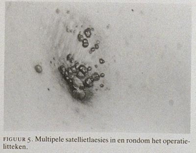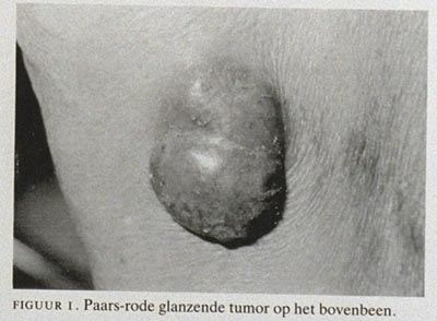 Rechts op de rug werd een handpalmgroot gebied gezien, opgebouwd uit een centraal litteken en omgeven door 20 livide-rode, bolvormige, vast-elastische tumortjes (figuur 5).