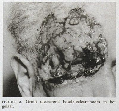 In het gelaat bevond zich een circa handgrote ulcererende tumor die omgeven werd door een opgeworpen, glanzende rand met teleangiëctasieën (figuur 2). Rechts pre-auriculair en in de hals waren enkele kleine, vast aanvoelende lymfklieren palpabel.