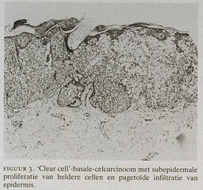 Het basale-celcarcinoom kent vele histologische varianten. Onlangs is melding gemaakt van een nieuwe (‘clear cell’) variant.1 Alle 6 tot op heden beschreven clear cell-basale-celcarcinomen toonden een nodulaire groeiwijze. De ziektegeschiedenis van onze patiënte is het eerste geval van clear cell-basale-celcarcinoom van het oppervlakkige type en met een pagetoïde groeiwijze. Bij elektronenmicroscopisch onderzoek is gebleken dat de clear cell-vorming waarschijnlijk het gevolg is van degeneratieve veranderingen. Er zijn geen aanwijzingen dat dit type basale-celcarcinoom meer maligne is dan het doorsnee nodulaire type. De belangrijkste betekenis van het clear cell-basale-celcarcinoom ligt op het gebied van de differentiële diagnostiek ten opzichte van naevomelanocytaire aandoeningen en andere epitheliale clear cell-tumoren.
