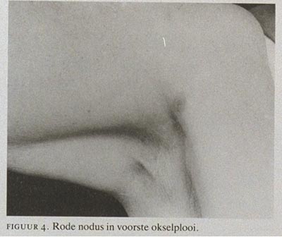 Ter hoogte van de posterolaterale zijde van de linker bovenarm was een subcutane nodus palpabel met erythemateuze overliggende huid. Op de anterolaterale zijde van deze arm werd een gebied van restpigmentatie gezien.