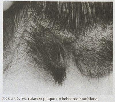 Op het behaarde hoofd werden enkele deels confluerende, nummulaire, scherp begrensde, papillomatotische en hyperkeratotische plaques gezien (figuur 6). Op de onderlip bij de man werd een lenticulair verrukeus gebied waargenomen.