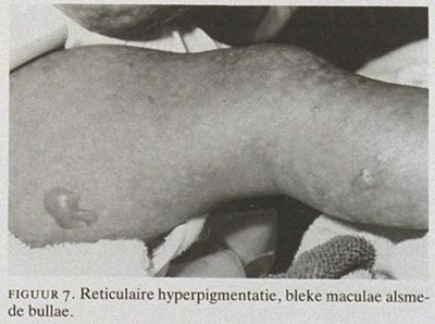 Totale atrichie op enkele haren op het occiput na. De huid van scalp, gelaat, nates en extremiteiten toont reticulaire hyperpigmentatie, lenticulaire witte vlekjes, enkele bullae en blaarresten (figuur 7). Patiëntje is te klein voor zijn leeftijd.