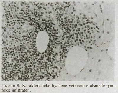 Met immunohistochemisch onderzoek kan men het polyklonale karakter van de B-celproliferatie in LBC aantonen en de aandoening zo differentiëren van het monoklonale CBCL. Op basis van dit criterium werden 22 patiënten met LBC en 35 patiënten met een CBCL zonder extracutane lokalisatie geselecteerd. Een groot aantal klinische en histologische kenmerken welke van belang zouden zijn voor de differentiatie tussen beide groepen werden onderzocht.1Uit het onderzoek kwam naar voren, dat geen van deze criteria in alle gevallen betrouwbaar is.