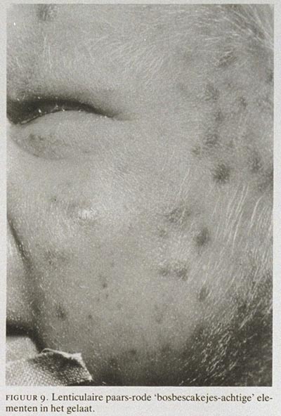 Verspreid over het gehele lichaam werden tientallen miliaire tot lenticulaire paars-rode, niet-wegdrukbare maculae en miliaire verhevenheden gezien (figuur 9).