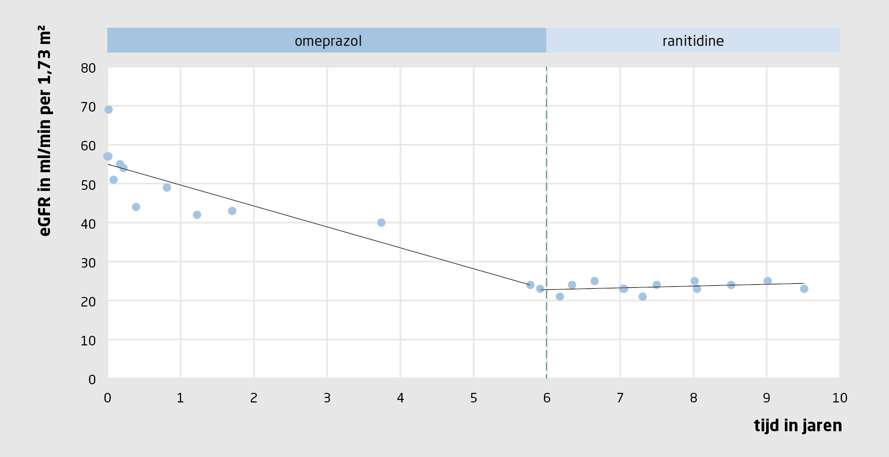 Patiënt A, een 74-jarige man, werd door de cardioloog verwezen naar de polikliniek Nierziekten vanwege progressieve chronische nierinsufficiëntie. Hij was onder controle bij de cardioloog vanwege geringe linkerventrikeldisfunctie (ejectiefractie: 43%). Verder vermeldde zijn medische voorgeschiedenis hypertensie (goed gereguleerd) en diabetes mellitus type 2 (vanaf 60-jarige leeftijd), zonder microvasculaire complicaties. Patiënt gebruikte acetylsalicylzuur 80 mg 1 dd, amlodipine 10 mg 1 dd, metoprolol 150 mg 1 dd, ezetimibe 10 mg 1 dd, simvastatine 20 mg 1 dd, insuline en sinds 8 jaar omeprazol 40 mg 1 dd. Patiënt gebruikte geen ACE-remmer, omdat hij vele jaren geleden angio-oedeem had ontwikkeld na gebruik van perindopril. In een periode van 6 jaar was de geschatte glomerulaire filtratiesnelheid (eGFR) gedaald van 57 naar 23 ml/min per 1,73 m2 (figuur 1). Ook had patiënt een matige proteïnurie (0,9 g per 24 h), zonder afwijkingen in het urinesediment.