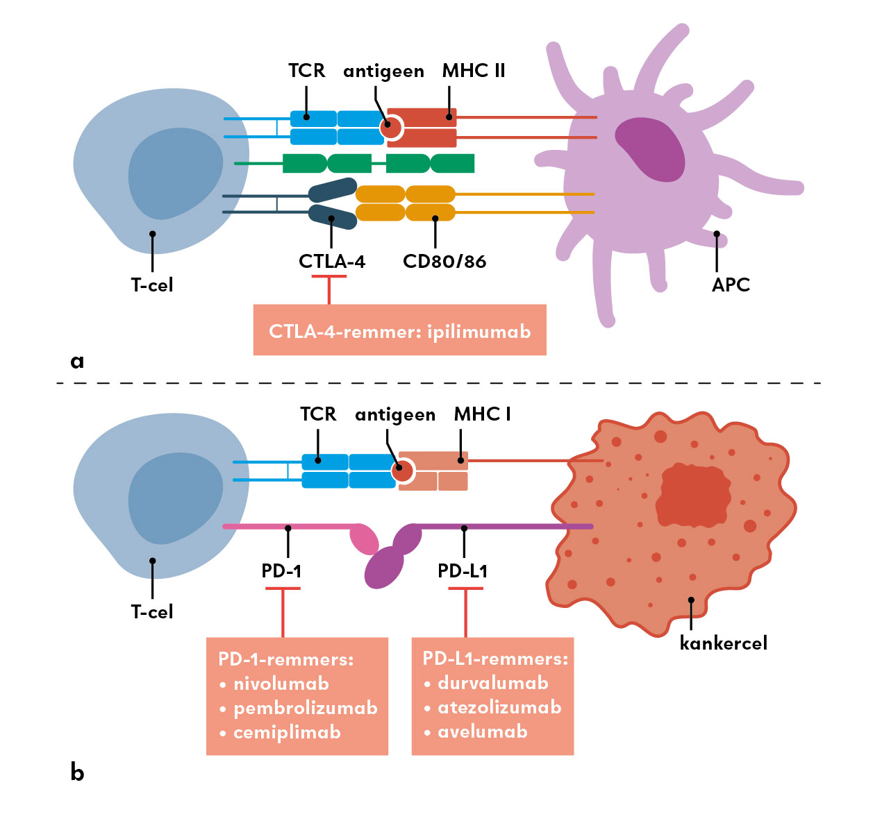 Checkpointremming is een vorm van immuuntherapie die een belangrijke rol speelt in de behandeling van vele soorten kanker. De checkpointremmers die momenteel het meest worden toegepast zijn monoclonale antilichamen gericht tegen de eiwitten PD-1, PD-L1 of CTLA-4 (tabel 1). Deze middelen kunnen worden toegediend als monotherapie, als combinatietherapie met twee verschillende checkpointremmers (meestal ipilimumab en nivolumab) of in combinatie met doelgerichte therapie.