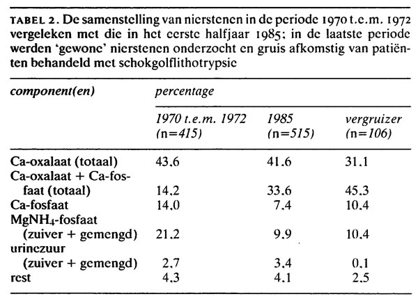 In tabel 2 is een vergelijking tussen de jaren 1970, 1971 en 1972 en het jaar 1985; in het laatste jaar zijn tevens de resultaten meegenomen van de eerste patiënten wier niersteen vergruisd werd.
