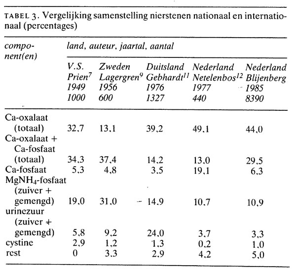 Een vergelijking van onze resultaten met die uit de buitenlandse literatuur is weergegeven in tabel 3. Daaruit komen duidelijke verschillen naar voren, die echter met voorzichtigheid geïnterpreteerd dienen te worden. De verschillen tussen onze resultaten en die van Prien et al. en (of) Lagergren9 kunnen als regionale verschillen beschouwd worden, maar eventueel ook als historische verschillen. Prien wijst daar later overigens ook op wanneer hij zijn eigen getallen van 1961 vergelijkt met die van 1948, en daarin bijv. het percentage infectiestenen met verloop van tijd ziet dalen.8 Betere antibiotica zou het voorkómen van urineweginfectie betekenen en daarmee ook van stenen. Dit zou overigens ook voor ons land kunnen gelden, getuige tabel 2, in het bijzonder het vóórkomen van de zgn. infectiestenen (Ca-fosfaat en MgNH4-fosfaat) in de jaren 1970 t.m. 1972 vergeleken met dat in 1985. Waar de historische factor niet telt, zien we enkele opvallende verschillen tussen de resultaten van Netelenbos12 en van onszelf en tussen die uit Duitsland11 en uit Nederland. In het eerste geval speelt de statistiek ons misschien parten (440 tegenover 8390 steenonderzoekingen), in het tweede geval, met name waar het urinezuur (en uraten en combinaties met andere componenten) betreft, kan gespeculeerd worden over een verschil in voedingsgewoonten.