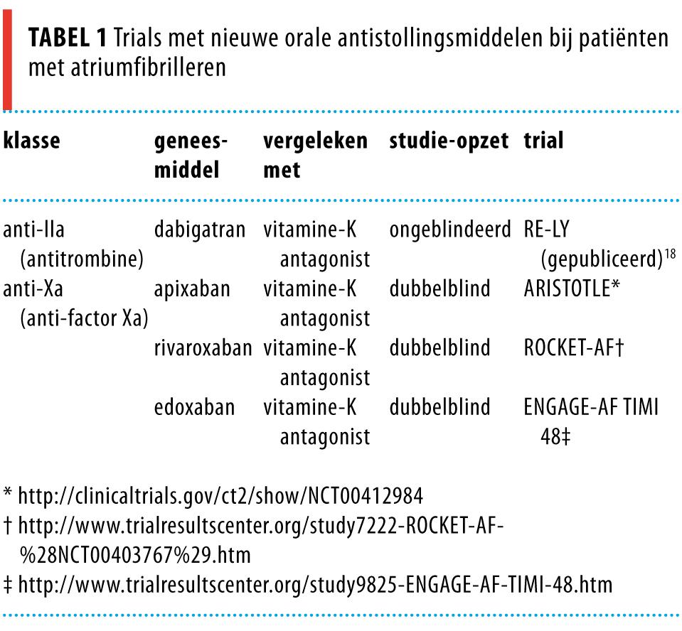 Op dit moment lopen 3 grote onderzoeken met orale directe factor Xa-blokkers ter voorkoming van trombo-embolie bij patiënten met atriumfibrilleren (zie tabel 1).19 Het gaat hier om ruim 50.000 patiënten, die dubbelblind worden gerandomiseerd naar een orale directe factor Xa-blokker of vitamine K-antagonisten met een streef-INR tussen 2 en 3. Als deze onderzoeken ook positief resultaat opleveren, kan worden gekozen uit een aantal nieuwe orale antistollingsmiddelen ter preventie van trombo-embolie bij patiënten met atriumfibrilleren.