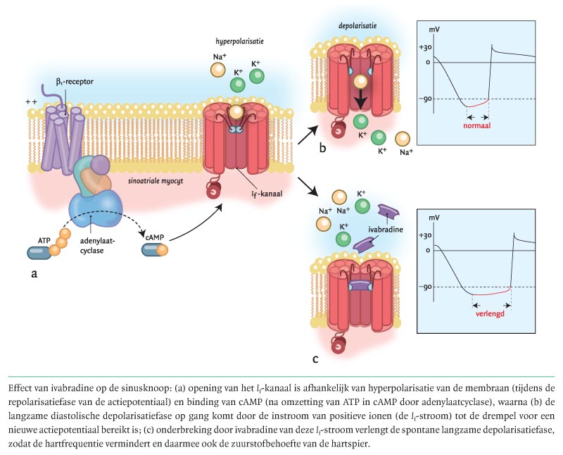 Ivabradine behoort tot een nieuwe klasse van middelen ter bestrijding van angina pectoris. De stof verlaagt de hartfrequentie door een selectieve en specifieke remming van de If-stroom in de sinusknoop die ten grondslag ligt aan de diastolische depolarisatie (figuur). Er is geen effect op ritmestoornissen.