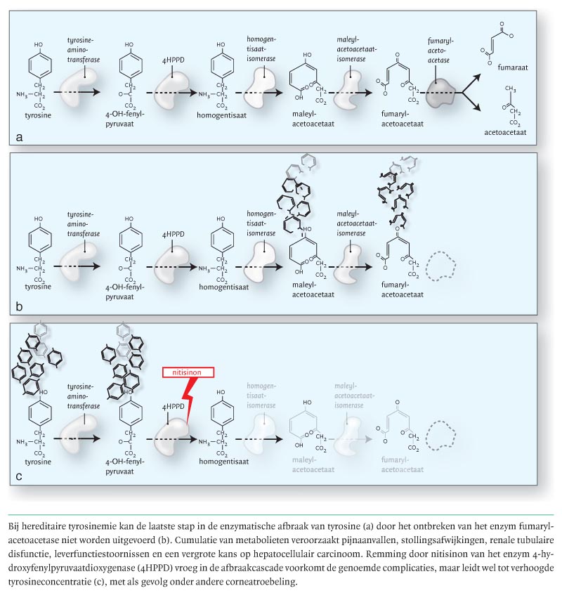 Nitisinon is een remmer van 4-hydroxyfenylpyruvaatdioxygenase (4HPPD). Het zeldzame toepassingsgebied is dat van hereditaire tyrosinemie. Dit is een aangeboren, levensbedreigende ziekte waarbij de laatste enzymatische stap in de afbraak van tyrosine niet kan worden uitgevoerd door het ontbreken van een enzym (figuur). Cumulatie van tyrosinemetabolieten leidt tot pijnlijke aanvallen, stollingsafwijkingen, renale tubulaire disfunctie, leverfunctiestoornissen en een vergrote kans op het ontstaan van hepatocellulair carcinoom. De prevalentie ligt tussen 1:100.000 (in Europa) en 1:20.000 geboorten. Nitisinon werd oorspronkelijk ontwikkeld als een herbicide, tot men ontdekte dat het afwijkingen aan de cornea veroorzaakte door verhoogde tyrosineconcentraties. Inmiddels is het middel effectief gebleken bij hereditaire tyrosinemie, met cornea-afwijkingen als een van de bijwerkingen. Door de remming van het enzym 4HPPD, dat zorgt voor een vroege stap in de afbraak van…