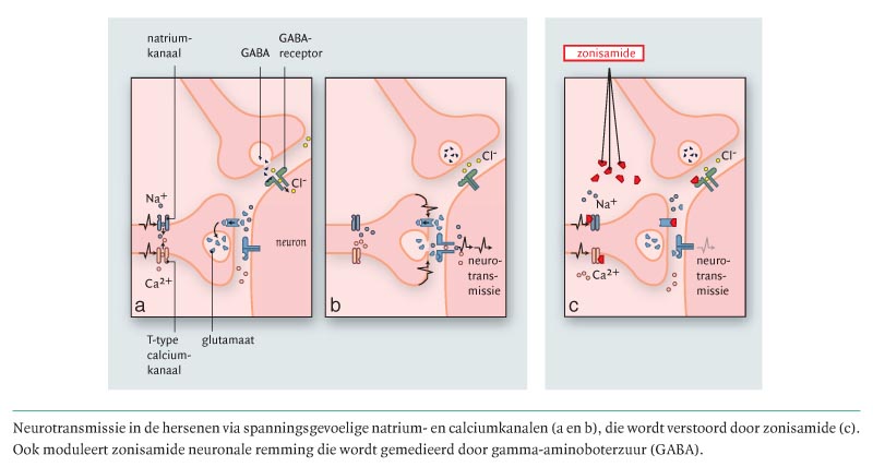 Zonisamide behoort tot een nieuwe klasse anti-epileptica die is ontwikkeld als adjuvans voor de behandeling van patiënten met partiële epilepsie, met of zonder secundaire generalisatie (Zonegran; www.emea.europa.eu, doorklikken op achtereenvolgens ‘Human medicines’ en ‘List of authorised products’). Zonisamide werkt op de spanningsgevoelige natrium- en calciumkanalen, waarbij de gesynchroniseerde neuronale afvuring wordt verstoord (figuur); hierdoor vermindert de spreiding van aanvalsontladingen. Tevens heeft zonisamide een modulerend effect op de gamma-aminoboterzuur(GABA)-gemedieerde neuronale remming. De stof is een benzisoxazoolderivaat met een sulfonamidegroep en heeft tevens een koolzuuranhydraseremmende werking. De bijwerkingen vertonen veel gelijkenis met die van de andere anti-epileptica, te weten reacties op het centrale zenuwstelsel en het ontstaan van psychiatrische ziektebeelden. Andere bijwerkingen zijn overgevoeligheidsreacties en de vorming van nierstenen.