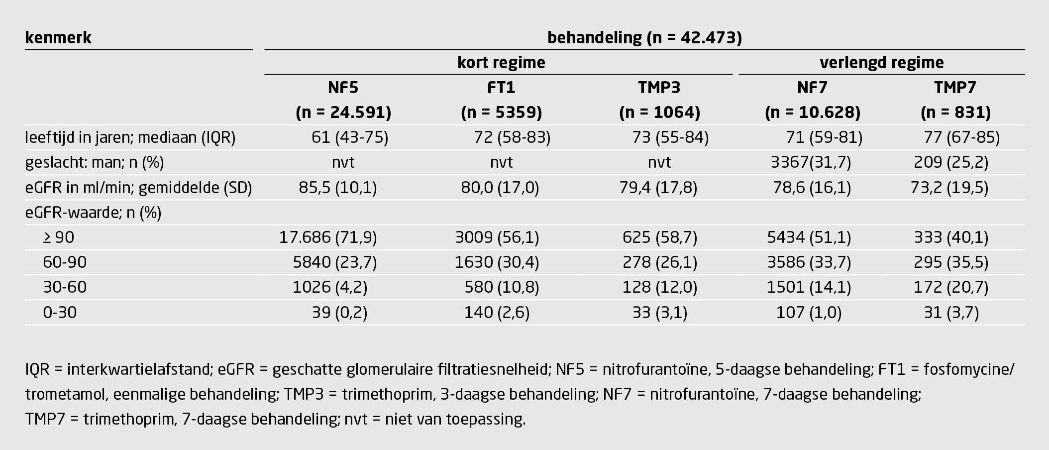 Uit Nederlandse huisartspraktijken werden gegevens verkregen over antibiotica voorgeschreven aan patiënten met cystitis in de periode januari 2013-juni 2019. Bij behandeling met nitrofurantoïne gedurende 5 dagen (NF5), eenmalig fosfomycine/trometamol (FT1) of trimethoprim gedurende 3 dagen (TMP3) bij niet-zwangere vrouwen (> 11 jaar) ging het om episodes van ongecompliceerde cystitis, en bij behandeling gedurende 7 dagen met nitrofurantoïne (NF7) of trimethoprim (TMP7) om gecompliceerde cystitis. Therapiefalen was gedefinieerd als een tweede antibioticumvoorschrift voor een urineweginfectie binnen 28 dagen. Logistische regressieanalyse werd toegepast met correctie voor demografische gegevens, comorbiditeit en urineweginfectie in de voorgeschiedenis.