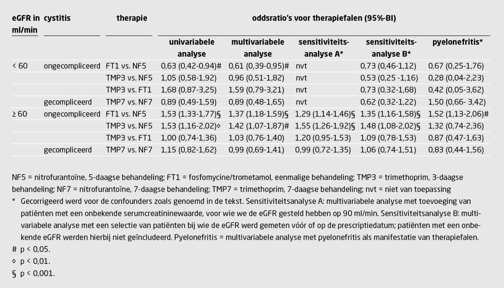 Elke daling in de nierfunctie met 10 ml/min verhoogde het risico op therapiefalen bij gebruik van NF5 (gecorrigeerde oddsratio (aOR): 1,05; 95%-BI: 1,01-1,09) en NF7 (aOR: 1,05; 1,02-1,09), maar niet bij gebruik van FT1 (aOR: 0,96; 0,92-1,01), TMP3 (aOR: 0,98; 0,89-1,08) of TMP7 (aOR: 1,02; 0,93-1,14). In de groep patiënten met ongecompliceerde cystitis en een eGFR ≥ 60 ml/min trad therapiefalen op bij 14,6% van de episodes na NF5 tegenover 20,7% na FT1 (aOR FT1 vs. NF5: 1,37; 1,18-1,59) en 20,8% na TMP3 (aOR vs. NF5: 1,42; 1,07-1,87). In de groep met een eGFR < 60 ml/min resulteerde behandeling met FT1 bij 16,0% van de patiënten in therapiefalen en met NF5 bij 23,3% van de patiënten (aOR: 0,61; 0,39-0,95).