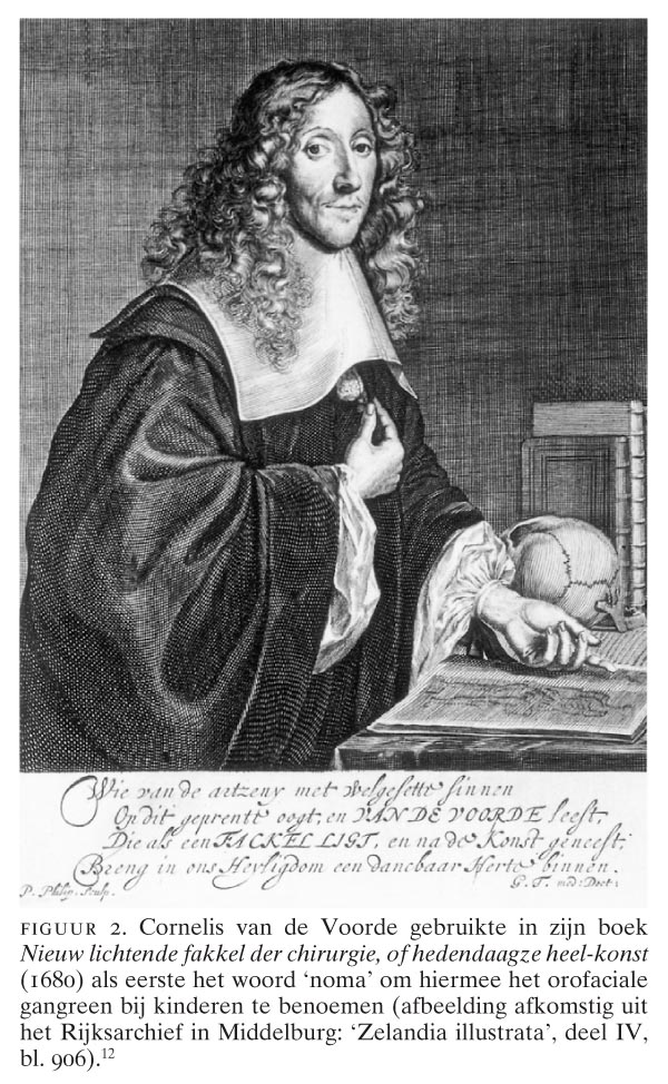 Aan het einde van de 17e eeuw zijn er verschillende auteurs, zoals Cornelis van de Voorde, Cornelis Stalpart van der Wielen en Joan Muis, die aandacht besteden aan noma.12-14 De belangrijkste bijdrage komt van Van de Voorde (1628-1678/1686?) (figuur 2), die in zijn boek Nieuw lichtende fakkel der chirurgie, of hedendaagze heel-konst, 1680) uitgebreid en zeer systematisch noma beschrijft.12 Bij de beschrijving van de symptomen geeft hij haarscherp aan waar het om gaat, want als bijna pathognomonisch voor de aandoening stelt hij dat deze ontstaat als ulceratie in vochtige weke delen, bijna altijd de mond van kinderen. Om die reden wordt naar zijn mening de aandoening ten onrechte ‘kanker’ genoemd. Dit onderscheid tussen ‘kanker’ en ‘ulceratie’ komt dan ook duidelijk naar voren in de titel van zijn hoofdstuk, waar hij het woord ‘waterkanker’ vermijdt: ‘Van de noma, of verrottende ulceratie’. Hiermee kreeg het orofaciale gangreen de benaming waarmee het heden ten dage het meest wordt aangeduid. Het woord ‘noma’ is een latinisering van het Griekse ‘???’, dat letterlijk ‘weidegrond’ of ‘het grazen’ betekent, maar in klassieke tijd ook al in overdrachtelijke zin gebruikt werd voor ‘het-al-voortgaande-grazen’ van vuur en van zweren. Van de Voorde is, voorzover bekend, de eerste auteur die het woord ‘noma’ gebruikt als specifieke aanduiding van het gelaatsgangreen bij kinderen.