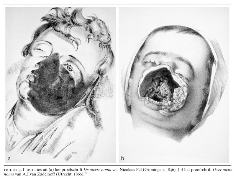 Halverwege de 19e eeuw lijkt noma in het middelpunt van de academische belangstelling te staan. In de periode 1838-1860 verschijnen er 6 proefschriften over noma.21 Veel wetenschappelijk nieuws brengen ze niet, maar sommige zijn wel fraai geïllustreerd met een lithografie (figuur 3). Wel is opvallend dat 2 proefschriften aandacht besteden aan het genitale gangreen, noma vulvae. Het is opmerkelijk dat in de moderne medische literatuur noma vulvae niet wordt aangetroffen. Dit kan betekenen dat de aandoening niet meer voorkomt in de wereld of een zodanig taboe is dat medische hulp niet wordt gezocht.