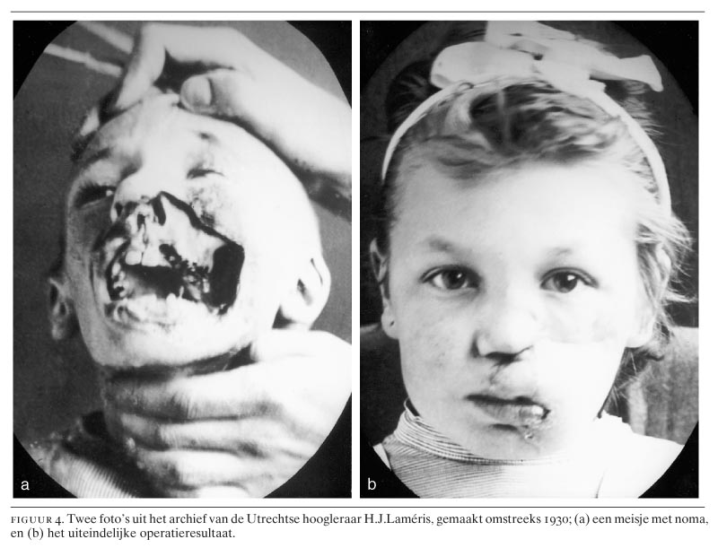 Plastische chirurgie, een chirurgisch subspecialisme dat deels ontwikkeld werd als bijzondere vorm van oorlogschirurgie tijdens beide wereldoorlogen, biedt goede mogelijkheden om de veelal ernstige gelaatsmisvormingen en functiestoornissen (incontinentia oris, trismus, spraakproblemen) operatief te corrigeren. De om zijn didactische gaven befaamde Utrechtse hoogleraar Heelkunde Hiddo Jan Laméris had een grote affiniteit met reconstructieve chirurgie. In zijn archief bevindt zich een fraaie serie foto's, aangevuld met tekeningen van een geslaagde gelaatsreconstructie bij een meisje met noma. Waarschijnlijk vond deze behandeling rond 1930 plaats (figuur 4).
