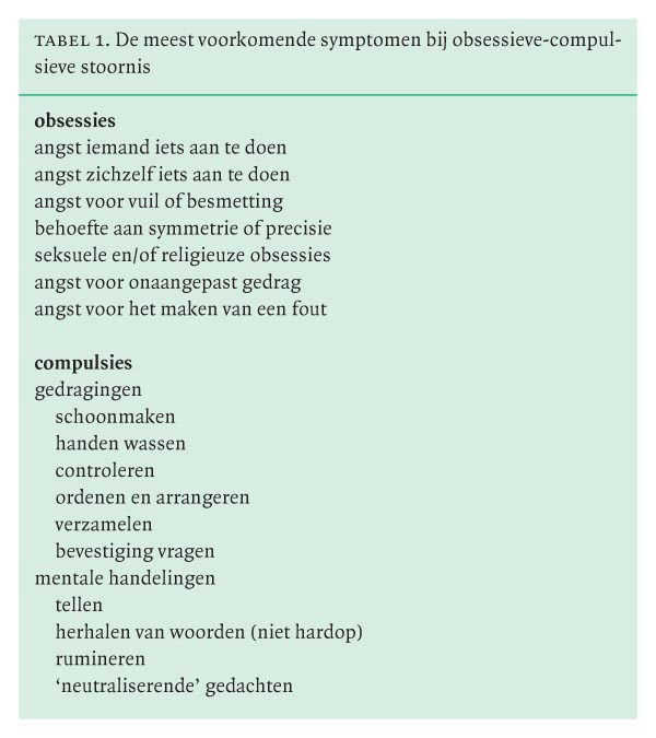 De obsessieve-compulsieve stoornis (OCS), ook bekend als dwangstoornis, wordt gekenmerkt door obsessies ofwel dwanggedachten, en compulsies ofwel dwanghandelingen. Obsessies zijn steeds terugkerende en hardnekkige gedachten, beelden of impulsen die als opdringend en niet-eigen beleefd worden. Ze veroorzaken angst of spanning, die vervolgens weer geneutraliseerd wordt door het uitvoeren van dwanghandelingen (tabel 1). Dit zijn herhaalde gedragingen of mentale activiteiten zoals het herhaald opzeggen van goede gedachten of het dwangmatig controleren. Deze gedragingen hebben vaak een ritueel karakter of moeten uitgevoerd worden volgens strikte regels (zie tabel 1).