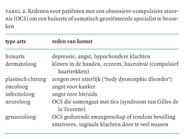 Patiënten met OCS bezoeken regelmatig somatische artsen voor de behandeling van gevolgen of symptomen van OCS (tabel 2), maar de onderliggende dwangstoornis wordt vaak niet als zodanig herkend. De periode tussen het ontstaan van symptomen en het begin van de behandeling is gemiddeld 14 jaar.5 Er is dan ook grote behoefte aan een snellere herkenning van OCS door artsen binnen de somatische zorg en aan een snellere verwijzing naar een psychiater.