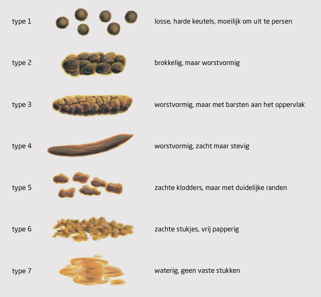 Patiënten met obstipatie hebben minder dan 3 keer per week defecatie. Defecatie bij obstipatie gaat ook vaak gepaard met veel persen (‘straining’), een gevoel van incomplete lediging van de darm, harde ontlasting en soms de noodzaak om feces digitaal te verwijderen. Patiënten met obstipatie wijzen op de Bristol-stoelgangkaart de types 1 en 2 aan (figuur 1).