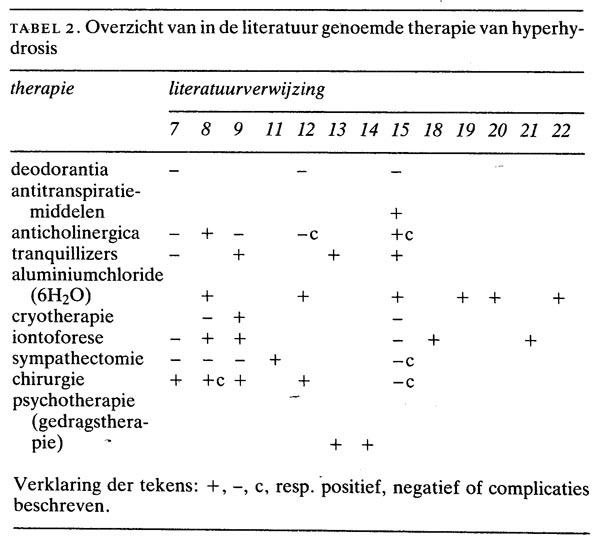Hoewel de meningen over de werkzaamheid van sympathectomie nogal verdeeld zijn,7-91115 beschrijven Bogokowsky et al. 42 patiënten van wie 41 na supraclaviculaire extrapleurale sympathectomie erg tevreden waren over het resultaat.11 Drie andere chirurgische methoden zijn: (1) de operatie volgens Skoog (subcutane verwij dering van zweetklieren na het omklappen van de huidlappen),715 (2) excisie van huid en zweetklieren,7815 (3) subcutane curettage van de zweetklieren.7 Een combinatie van deze drie methoden is ook mogelijk. Ondanks complicaties worden van deze chirurgische methoden goede resultaten gezien.7-912