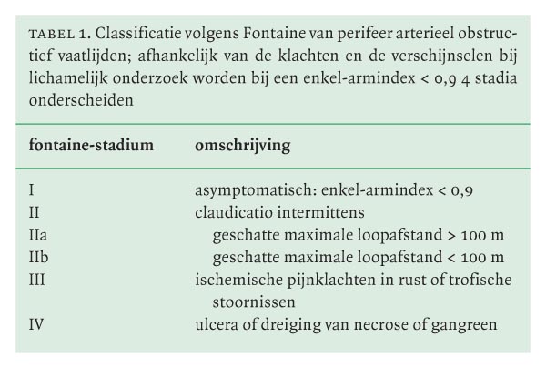 Perifeer arterieel obstructief vaatlijden (PAOV) is een veelvoorkomende aandoening bij vooral oudere Nederlanders. Per dag worden in Nederlandse ziekenhuizen 44 patiënten opgenomen wegens perifeer arterieel vaatlijden.1 De geschatte prevalentie van alle stadia van PAOV bij patiënten ouder dan 55 jaar is omstreeks 20.2 Van alle patiënten bij wie PAOV gediagnosticeerd is, wordt 50 binnen 5 jaar getroffen door een hart- of herseninfarct en 28 overlijdt binnen deze termijn aan de gevolgen van gegeneraliseerd vaatlijden.3 De ernst van de ziekte wordt ingedeeld volgens de stadia van Fontaine (tabel 1). De ziekte is progressief van aard en wordt symptomatisch zodra claudicatio intermittens ontstaat. Bij 4,3-9,6 van de patiënten leidt PAOV uiteindelijk tot kritieke ischemie, gekenmerkt door persisterende pijn in rust en nachtelijke pijn, eventueel met ulcera (figuur 1) en zelfs necrose of gangreen; dit is stadium III-IV volgens de fontaine-classificatie.3 4…