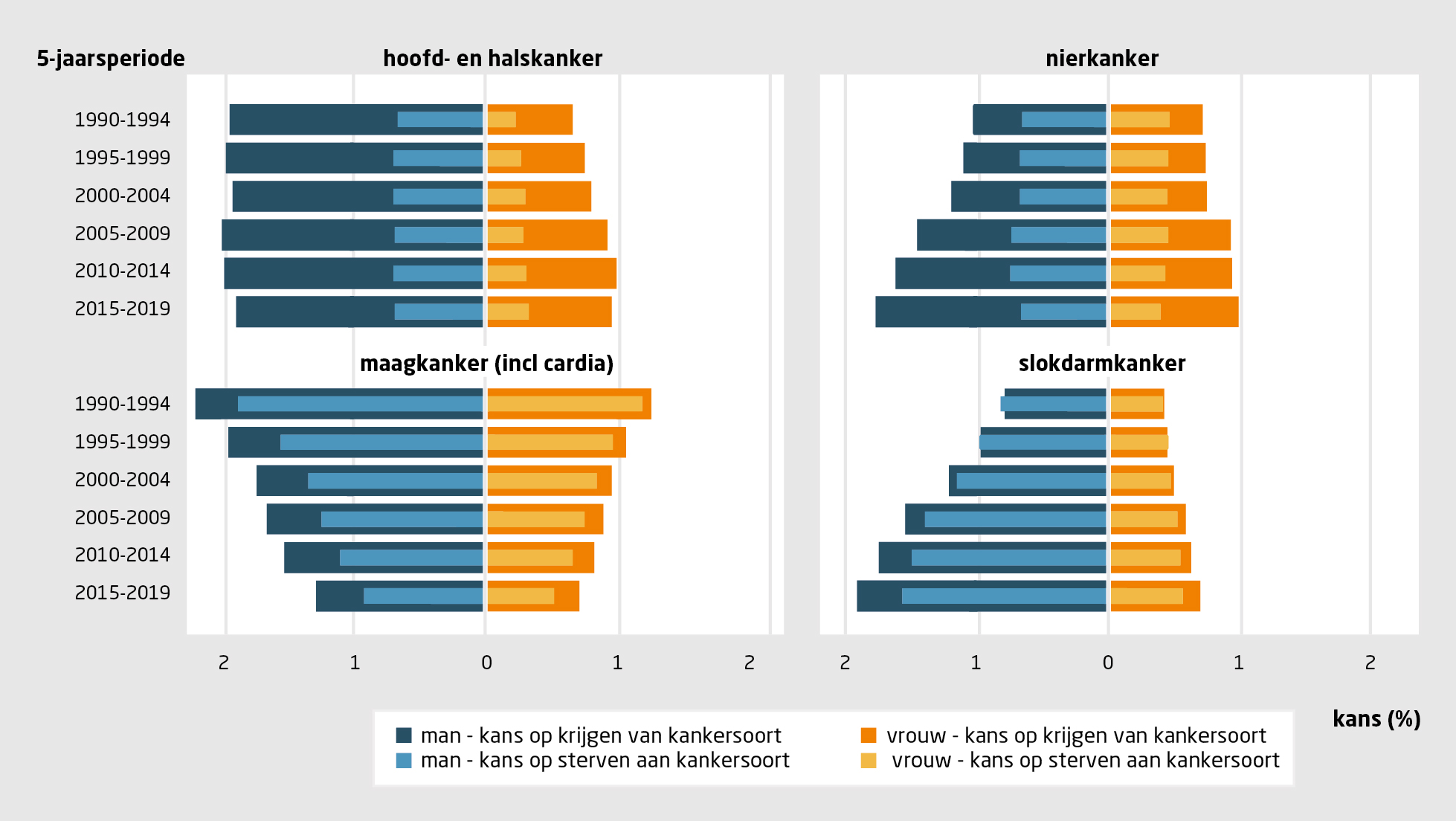 Mannen hebben een grotere kans op hoofd-halskanker dan vrouwen (figuur 3). Voor mannen is deze kans stabiel rond de 2,0%; voor vrouwen is deze in dertig jaar gestegen van 0,7% naar 1%. De kans op nierkanker is voor mannen en vrouwen gestegen, maar de kans om eraan te overlijden is nagenoeg niet veranderd. De kansen op het krijgen van maagkanker is gedaald, terwijl de kans om slokdarmkanker te krijgen is gestegen.