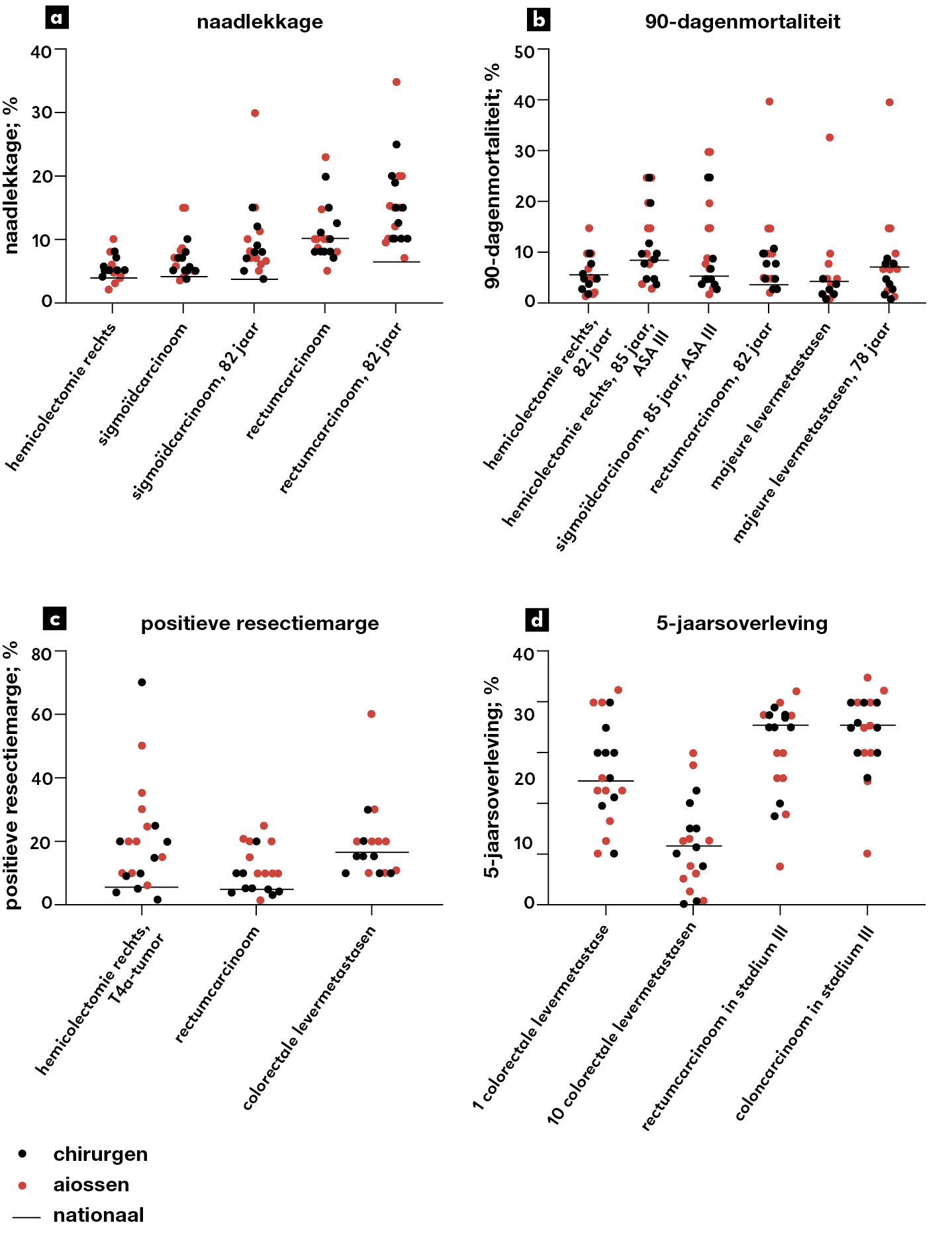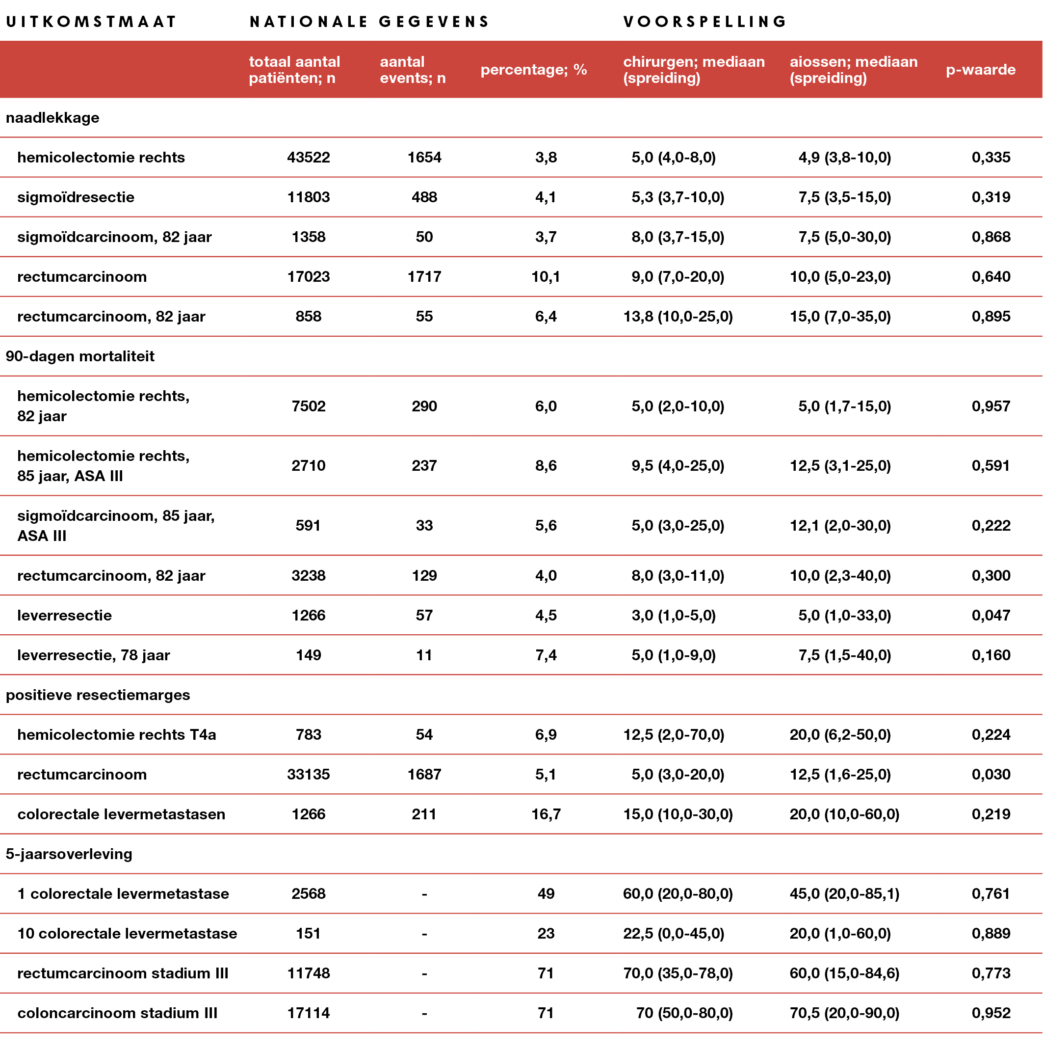 In een door ons verrichte enquête in een groot topklinisch ziekenhuis bleek dat chirurgen (n = 10) en aiossen (n = 10) gemiddeld genomen de uitkomsten van chirurgische behandeling redelijk goed voorspellen, maar dat er grote variatie bestaat tussen de individuele schattingen. Hoewel de gemiddelde inschatting redelijk accuraat is, kan de nauwkeurigheid afhangen van welke zorgverleners bij het MDO aanwezig zijn, wat het behandeladvies kan beïnvloeden. Uit onze gegevens blijkt dat het geschatte risico op complicaties, zoals naadlekkage en de 90-dagenmortaliteit, overeenkomt met de werkelijkheid (tabel). Bij patiënten uit een specifieke subgroep, zoals patiënten met een hoge leeftijd of bepaalde comorbiditeit, verslechtert de inschatting aanzienlijk. Zo wordt de overleving van oudere patiënten onderschat, wat eerder in Nederlands onderzoek is aangetoond.3 De langetermijnsuitkomsten van patiënten met levermetastasen worden aanzienlijk overschat (figuur). Hoewel de mediane geschatte overleving van patiënten met colon- of rectumcarcinoom in stadium III overeenkomt met de landelijk geobserveerde overleving, valt met name de spreiding in de schattingen op. Het beeld bestaat dat chirurgen tijdens overleggen vaak de uitkomsten van hun handelen zich te rooskleurig voorstellen. In de literatuur is van deze overschatting onder anderen ook sprake bij oncologen.4,5 Zoals aangegeven wordt dit beeld slechts deels onderschreven door de uitkomsten van onze enquête; met name valt de spreiding in individuele schattingen op. Hoewel het MDO wordt voorbereid – in tegenstelling tot een dergelijke enquête – zijn de bevraagde casussen dermate alledaags dat wij veronderstellen dat niet alle ondervraagden de overleving van zulke patiënten in de literatuur hoeven op te zoeken.