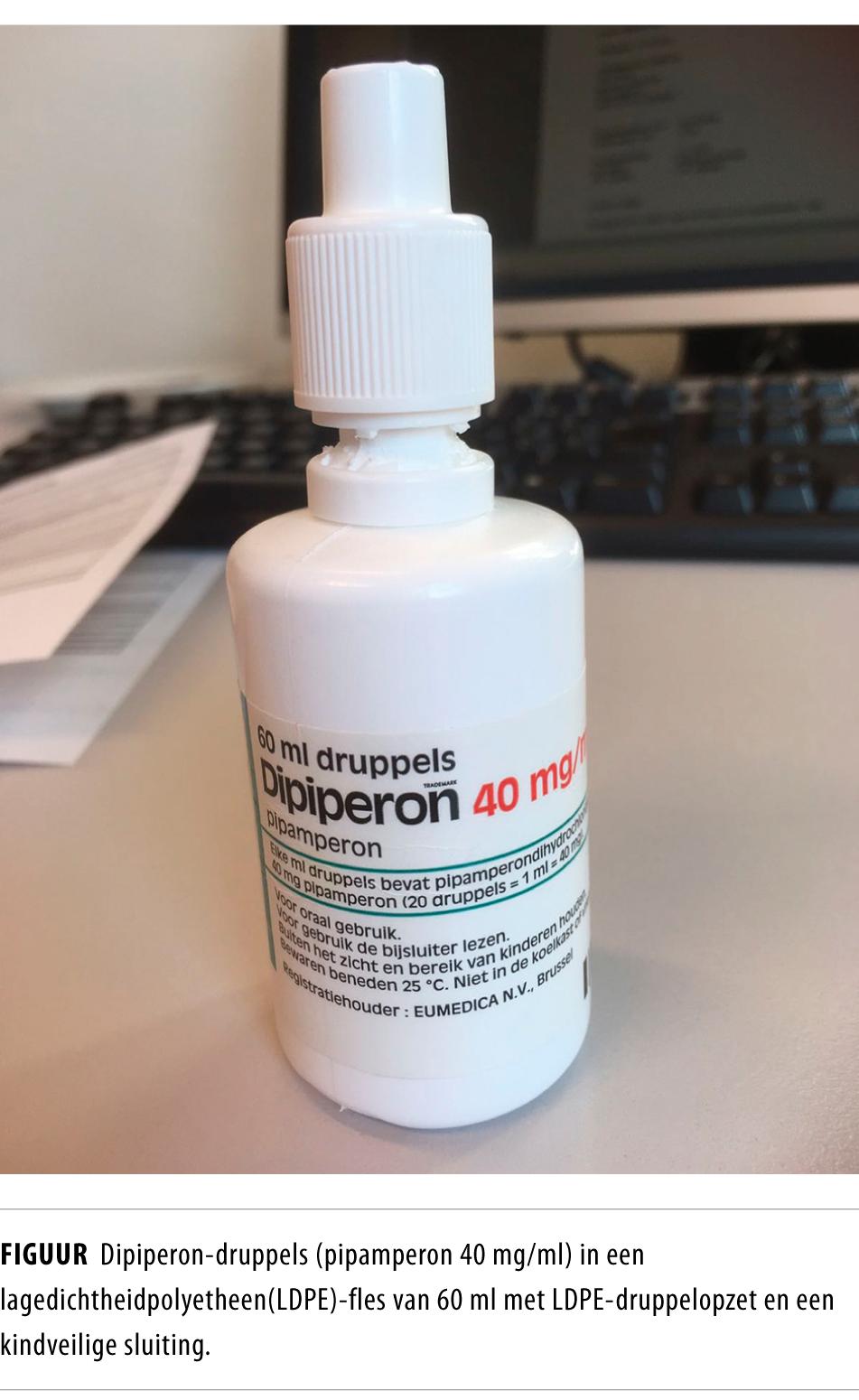 In Nederland is pipamperon op de markt als Dipiperon in tabletvorm (40 mg/tablet) en druppelvorm (40 mg/ml) en als tablet onder de generieke naam (Sandoz, 40 mg/tablet).3,4 Dipiperon-druppels worden in Nederland geleverd in een lagedichtheidpolyetheen(LDPE)-fles van 60 ml met LDPE-druppelopzet en een kindveilige sluiting (figuur). De LDPE-fles bevat 1200 druppels (20 druppels/ml). De bijsluiter instrueert de gebruiker om de fles op zijn kop te houden en zachtjes in de fles te knijpen voor het benodigde aantal druppels.