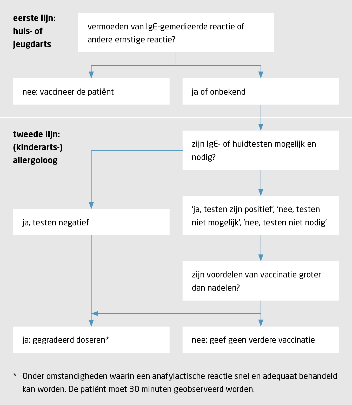 Als een arts vermoedt dat een patiënt een overgevoeligheidsreactie heeft gehad op een vaccin of vaccincomponent, beoordeelt hij of zij hoe ernstig die reactie is geweest en wat het risico is op een reactie bij toekomstige blootstelling aan de betreffende vaccincomponent (figuur). T-celgemedieerde reacties, bijvoorbeeld contacteczeem, of algemene bijwerkingen als koorts of hoofdpijn zijn geen contra-indicatie voor vaccinatie.1,5 Wanneer een reactie als ernstig of klinisch relevant is beoordeeld, zijn voorzorgsmaatregelen onder regie van de allergoloog gewenst bij een vervolgvaccinatie.