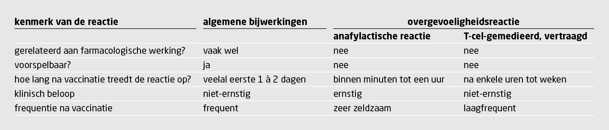 IgE-gemedieerde, anafylactische reacties (type I) en T-celgemedieerde reacties (type IV) zijn als onverwachte bijwerkingen van vaccins beschreven (tabel 1).9 Anafylactische reacties treden snel op, meestal met meerdere dermatologische (erytheem, urticaria, angio-oedeem, jeuk), respiratoire (bronchospasmen, oedeem in de hoge luchtwegen), cardiovasculaire (hypotensie, tachycardie, bewustzijnsverlies, hartkloppingen) en gastro-intestinale symptomen (misselijkheid, overgeven, diarree). T-celgemedieerde reacties, zoals contacteczeem, kunnen vanaf enkele uren na vaccinatie optreden en gaan in de regel gepaard met geringe verschijnselen.5,9