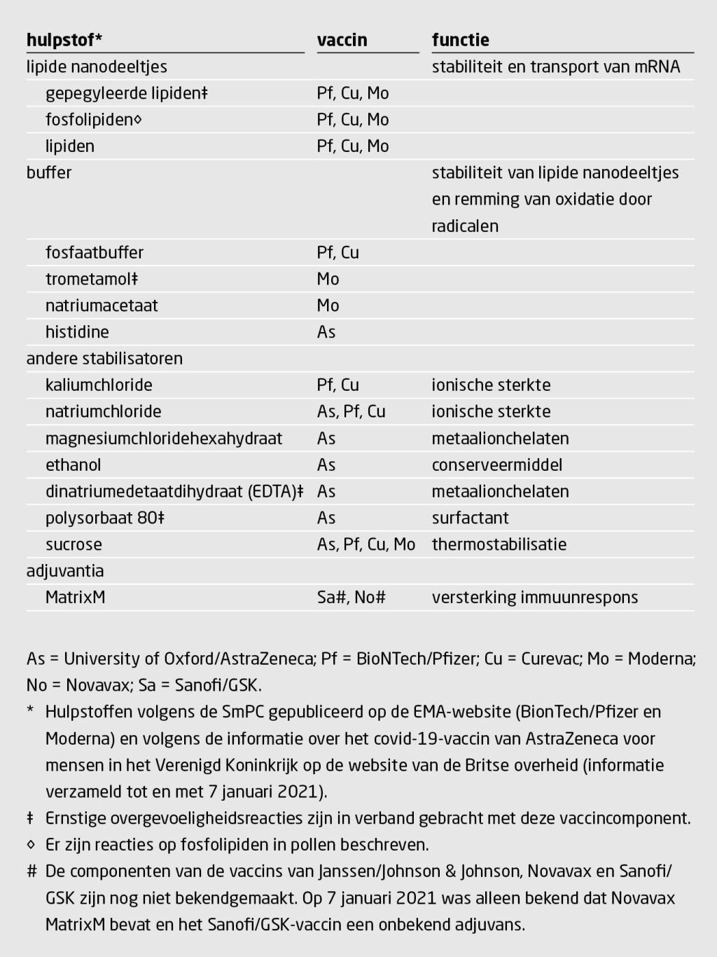 De overige stoffen in covid-19-vaccins bestaan voor het grootste deel uit ionen, buffers en sucrose om de fysische stabiliteit van het vaccin te waarborgen. Het Moderna-vaccin bevat trometamol als buffer. Er is een patiënt beschreven die een anafylactische reactie ontwikkelde na blootstelling aan trometamol in een injectievloeistof.19 Ook EDTA – een bestanddeel van het AstraZeneca-vaccin – is bij parenterale blootstelling 1 maal in verband gebracht met een anafylactische reactie.20