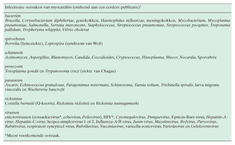 Myocarditis is een ziektebeeld dat wordt gedefinieerd als een ontsteking van de hartspier. Het blijkt dat myocarditis vaak subklinisch verloopt en mede daardoor veel vaker voorkomt dan wordt aangenomen. Uit routinematig uitgevoerd post-mortemonderzoek is gebleken dat 1-9 van alle overledenen een myocardiale ontsteking had.1 Myocarditis kent vele ontstaanswijzen. Bij vrijwel iedere immuunziekte kan myocarditis een uiting zijn (meestal sarcoïdose, scleroderma, lupus erythematodes disseminatus). Daarnaast zijn er vele stoffen die een toxische myocarditis kunnen veroorzaken (gifbeten, antibiotica, ethanol, zware metalen, drugs). De infectieuze myocarditis wordt meestal veroorzaakt door een virus, maar ook bacteriën, schimmels en parasieten kunnen de aandoening teweegbrengen (tabel).2 Aangenomen wordt dat in Noord-Amerika en Europa enterovirussen de voornaamste oorzaak van myocarditis zijn.3 In Zuid-Amerika is de ziekte van Chagas (Trypanosoma cruzi) de frequentste oorzaak van myocarditis. Bacteriële myocarditis is relatief zeldzaam.2 De ernst van een myocarditis kan…