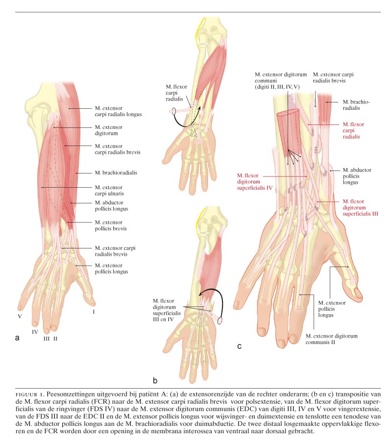 Na de wondgenezing toonde neurologisch onderzoek een volledige afwezigheid van de pols-, vinger- en elleboogextensie als gevolg van de N.-radialislaesie. De Nn. medianus en ulnaris waren functioneel nagenoeg volledig hersteld. Vanwege de invaliderende uitval van de pols- en vingerextensie werden ruim een jaar na het ongeval de volgende peestransposities uitgevoerd: ten eerste van de oppervlakkige buiger van de middelvinger naar de strekkers van de duim en de wijsvinger, ten tweede van de oppervlakkige buiger van de ringvinger naar de strekkers van middelvinger, ringvinger en pink, ten derde van de radiale polsbuiger naar de korte radiale polsstrekker en tenslotte werd een tenodese verricht van de lange duimabductor aan de M. brachioradialis (figuur 1). In een later stadium werd een transpositie verricht van het achterste deel van de M. deltoideus naar de insertie van de M. triceps brachii vanwege de afwezige elleboogextensie. Hierbij werd de M. deltoideus met fasciestrippen verlengd.
